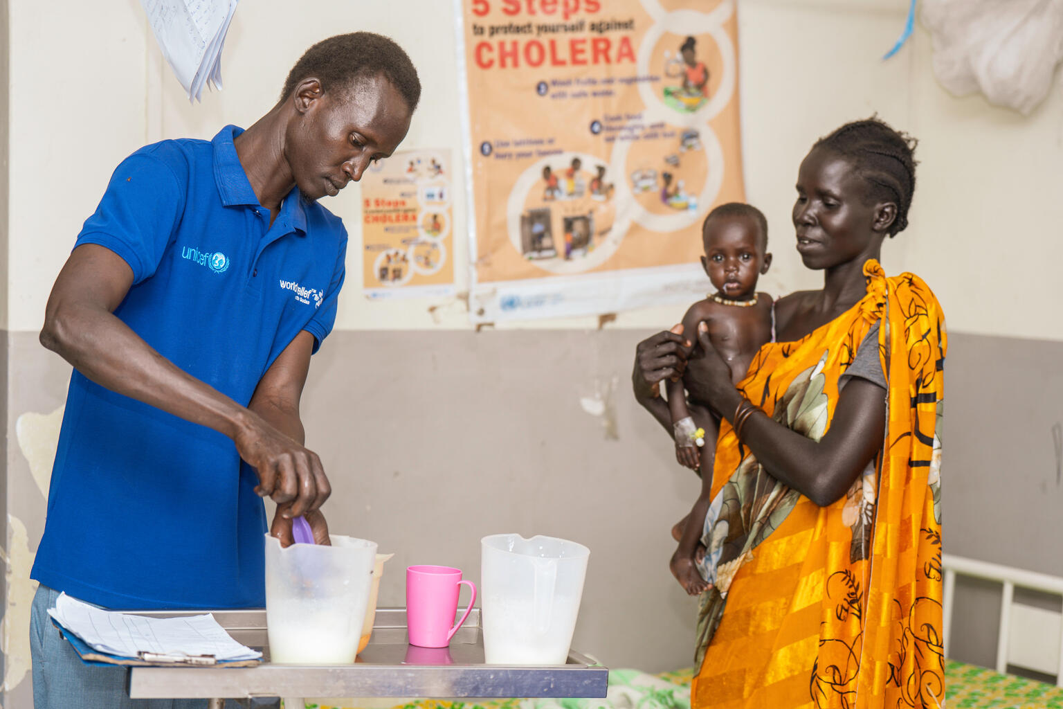 ユニティ州にあるユニセフ支援の栄養治療センターで、栄養不良の子どものために治療食を準備するスタッフ(南スーダン、2025年3月14日撮影)