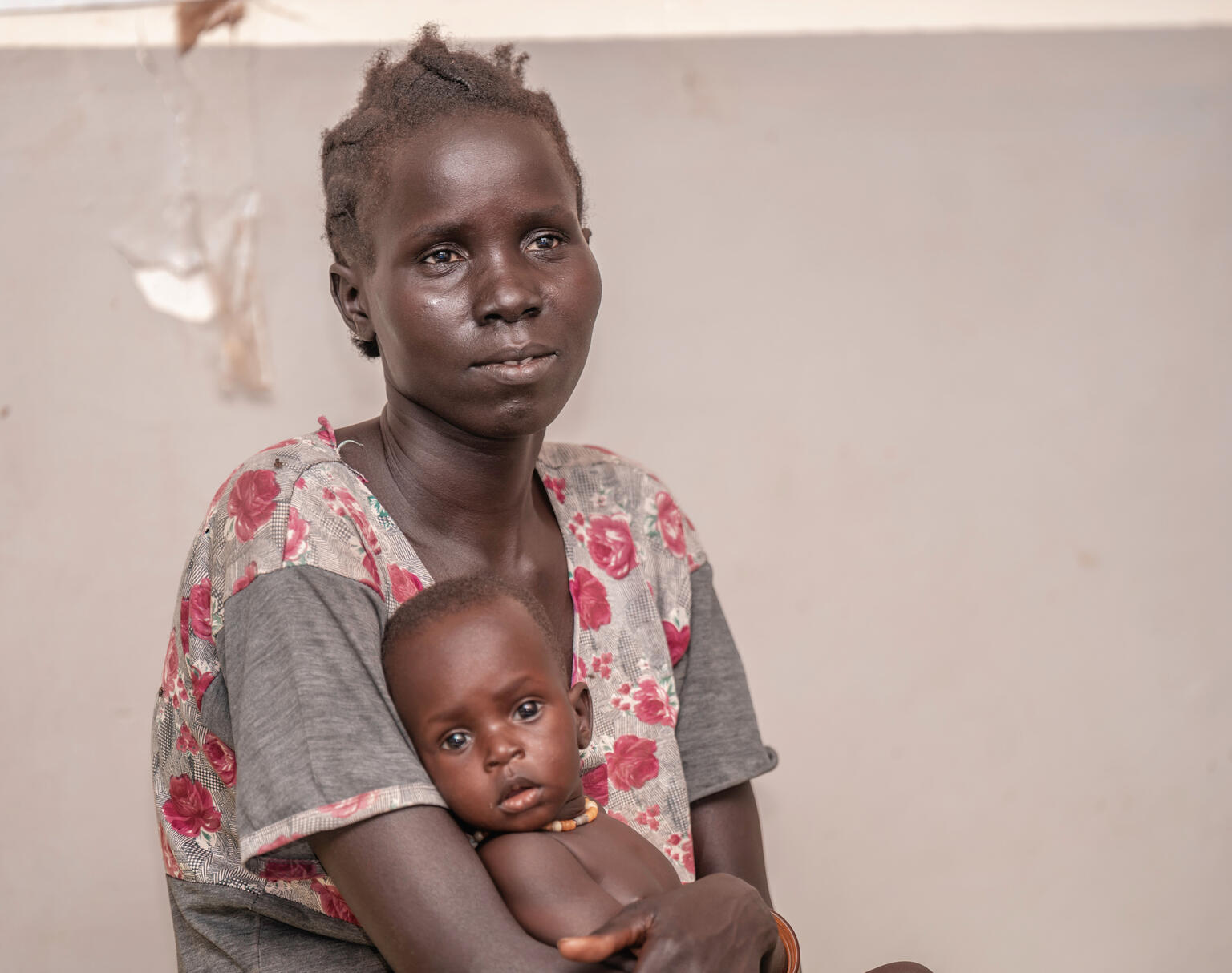 ユニティ州にあるユニセフ支援の栄養治療センターで、1歳の娘を抱く母親(南スーダン、2025年3月14日撮影)