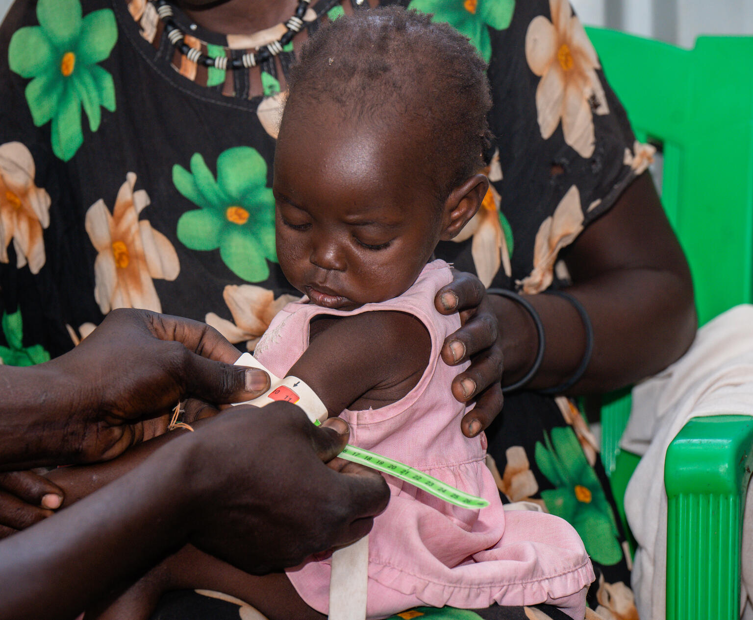 国内避難民キャンプで、上腕計測メジャーを使った栄養状態の検査を受け、赤色=重度の急性栄養不良と示された3歳の女の子(南スーダン、2025年3月14日撮影)
