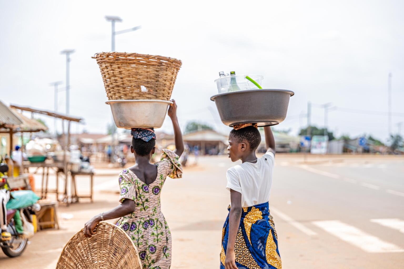 クフォの市場で売るために、飲料やカゴを運ぶ女の子たち(ベナン、2025年3月13日撮影)