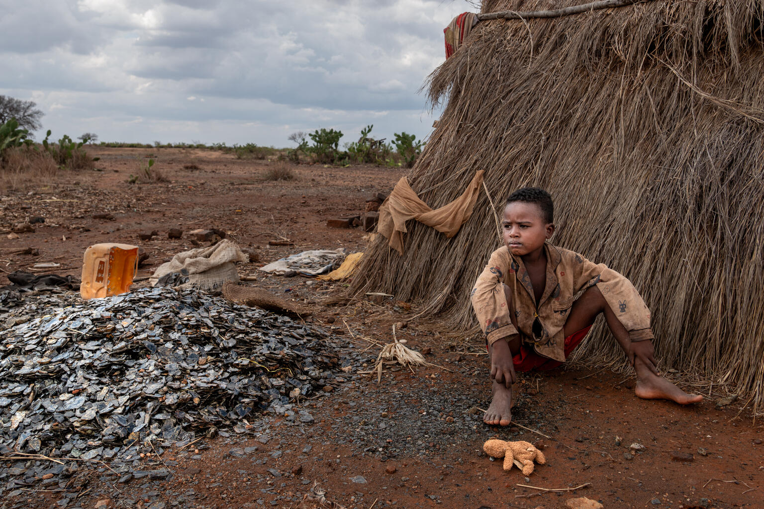 アンドロイ県にある鉱山で働く8歳の男の子。気候変動の影響により雨量が減ったことで、農業をあきらめた両親も、同じ鉱山で働いている(マダガスカル、2024年9月26日撮影)