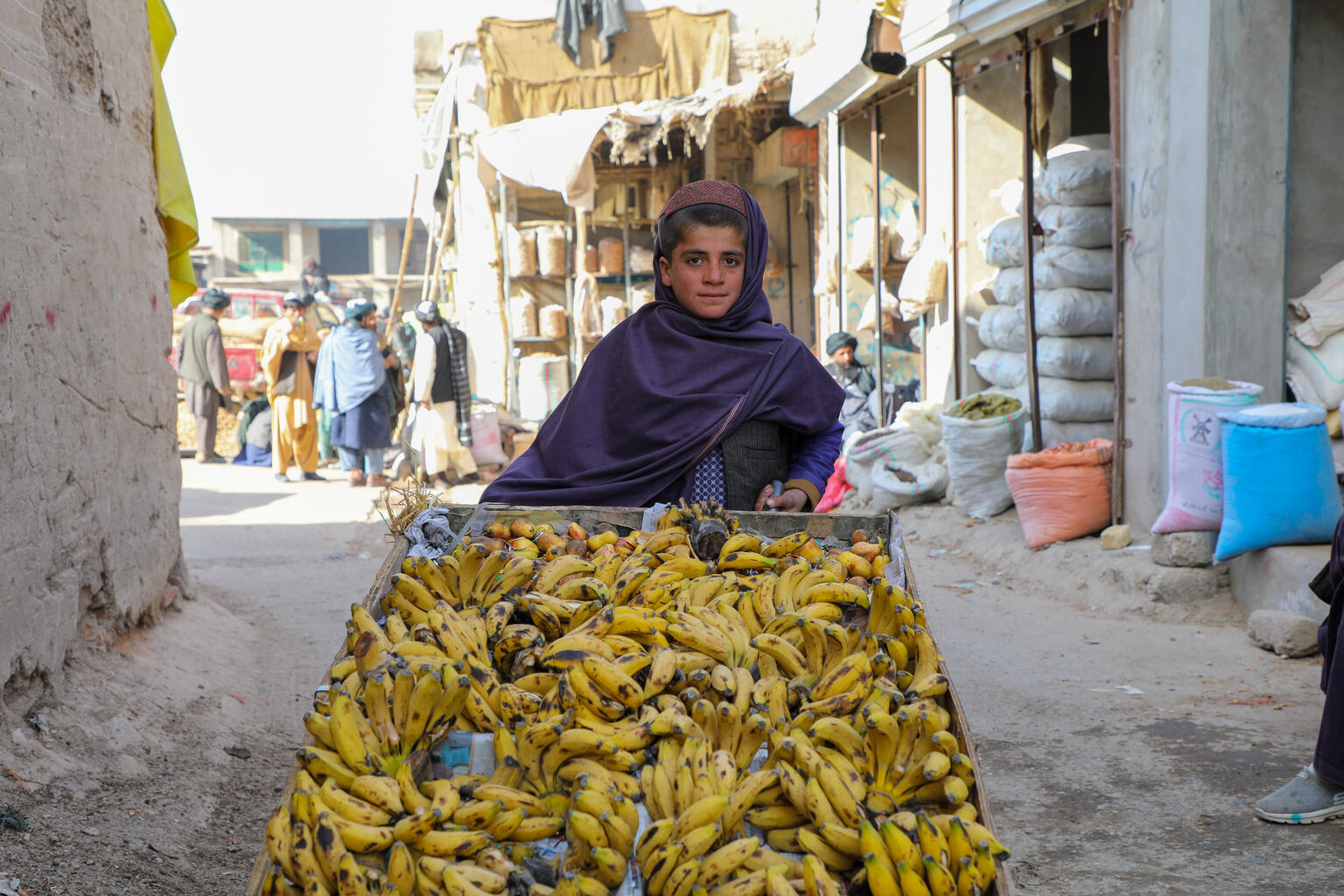 ウルズガンの路上でバナナを売る12歳のラフィクラさん。学校には通っていない(アフガニスタン、2021年1月16日撮影)