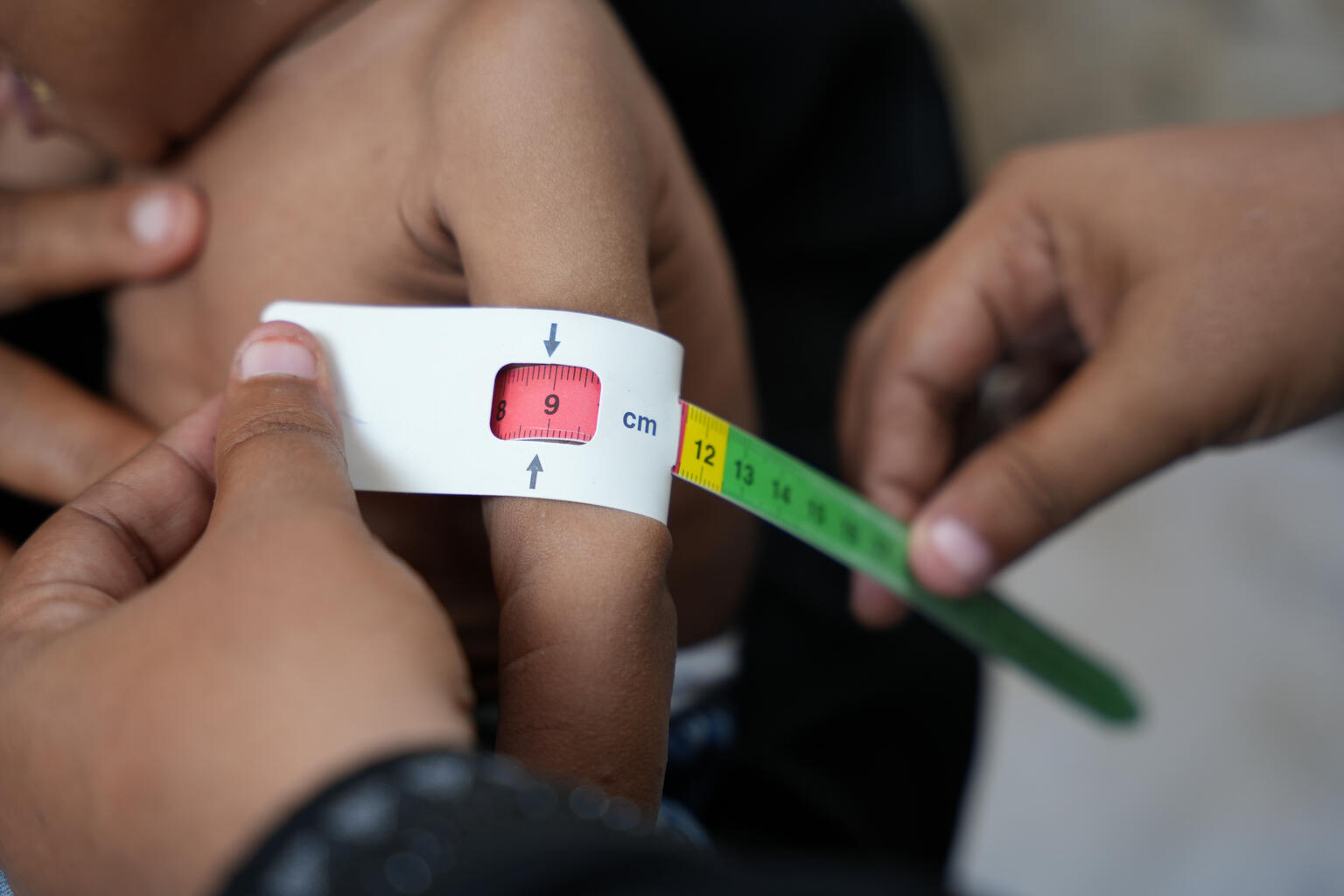 ユニセフが支援している移動診療所で、上腕計測メジャーを使った栄養状態の検査を受け、赤色=重度の急性栄養不良と示された子ども(イエメン、2024年11月27日撮影)