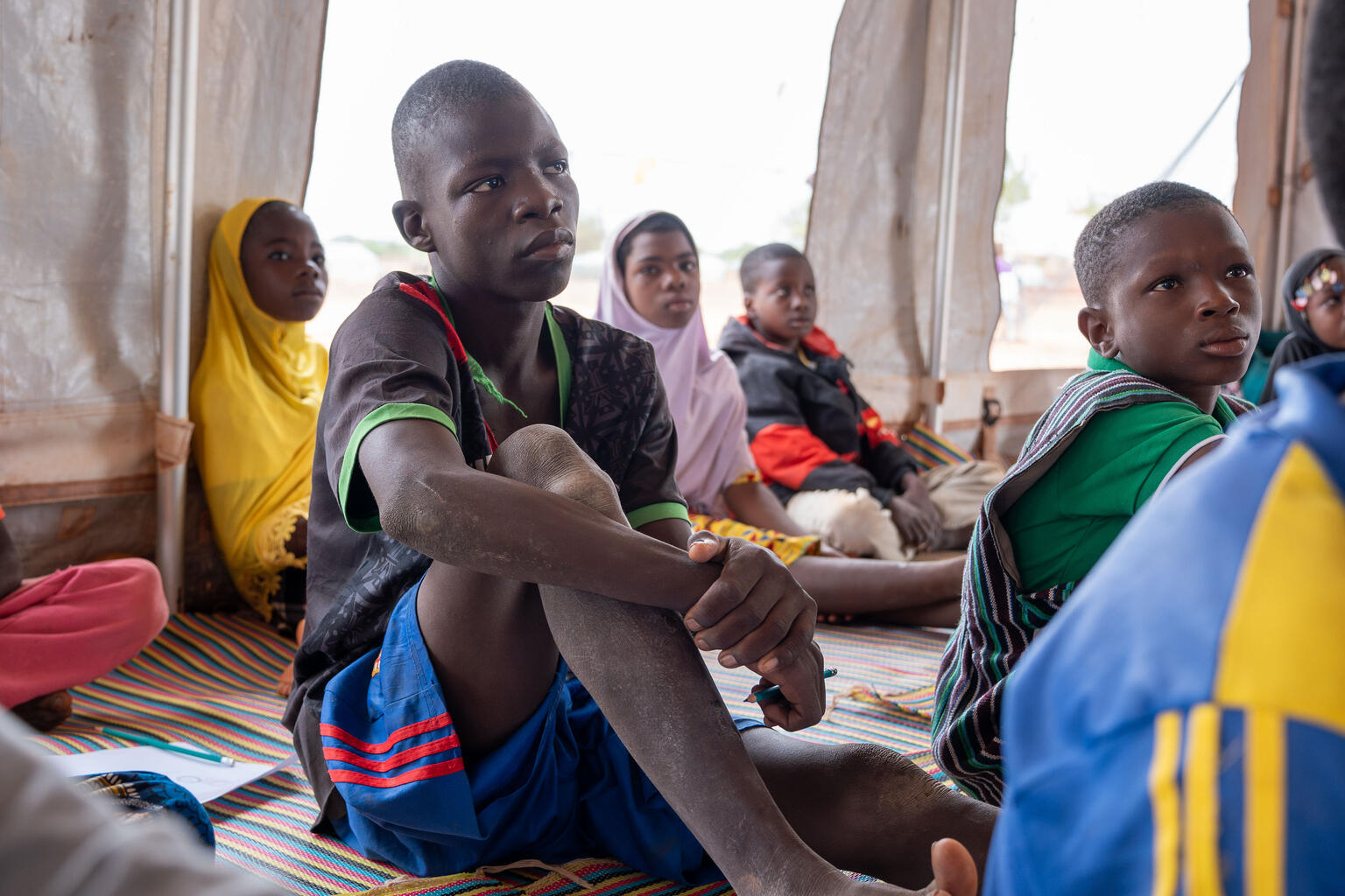 ユニセフが支援する「子どもにやさしい空間」で、心理社会的なケアを受ける14歳のイブラヒムさん。父親が殺害され、自身も暴力を受けたことでトラウマを抱えている(ブルキナファソ、2025年6月20日撮影)