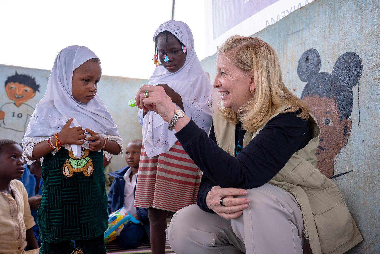 ブルキナファソ東部ファダングルマに設置された「子どもにやさしい空間」を訪問するユニセフのラッセル事務局長(ブルキナファソ、2025年6月20日撮影)