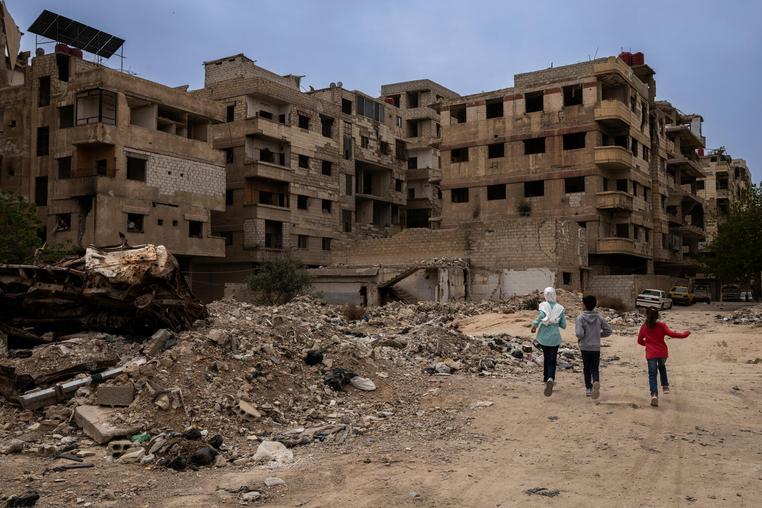 紛争の爪痕が残るダマスカス郊外県の街をきょうだいと一緒に走る11歳のバシマさん。不発弾の危険性を学び、弟が家に持ち帰っていた薬きょうを安全に処分するように説得した(シリア、2025年4月10日撮影)