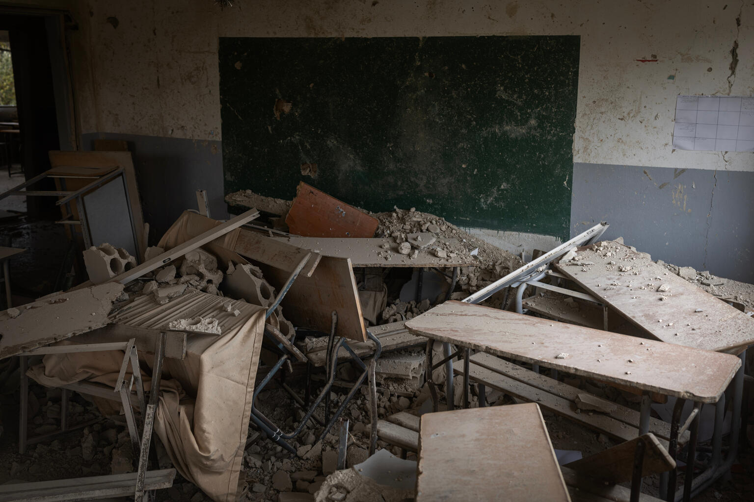 レバノン南部の国境沿いにある、紛争で破壊された学校の教室。国内の半数近くの児童や生徒が避難を余儀なくされ、数百もの学校が閉鎖されたままである(レバノン、2025年2月15日撮影)