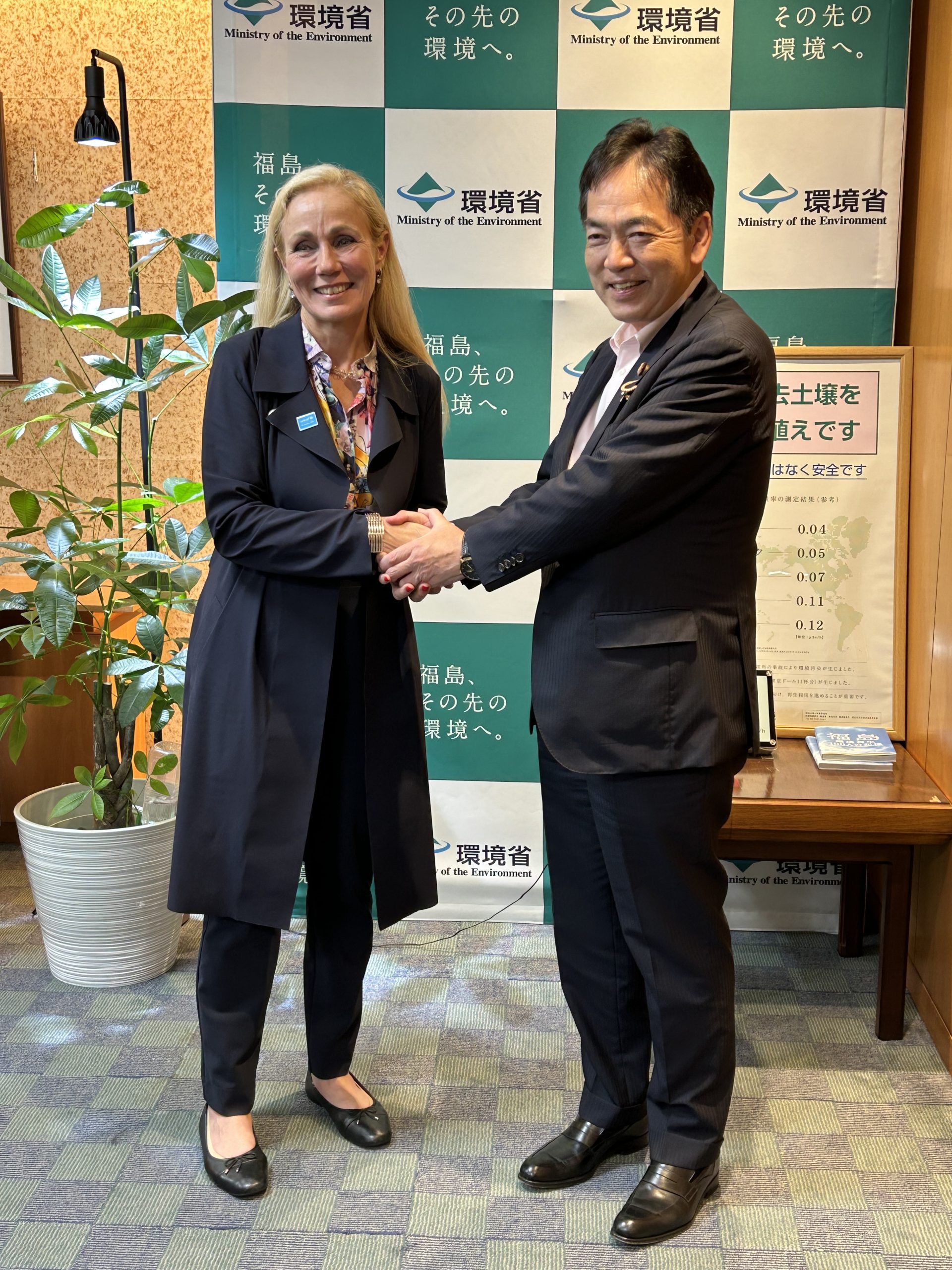 キティ・ファン・デル・ハイデン ユニセフ事務局次長(左)と、浅尾慶一郎環境大臣(右)