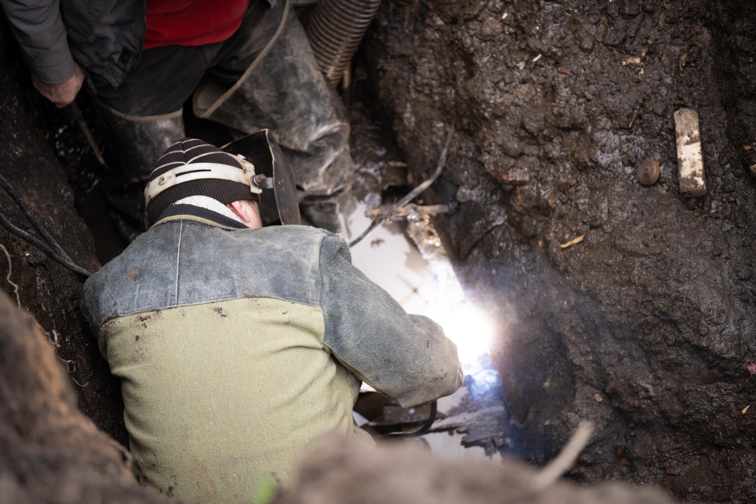 ドネツク州で、破損したパイプを修理する水道会社の作業員(ウクライナ、2025年3月18日撮影)