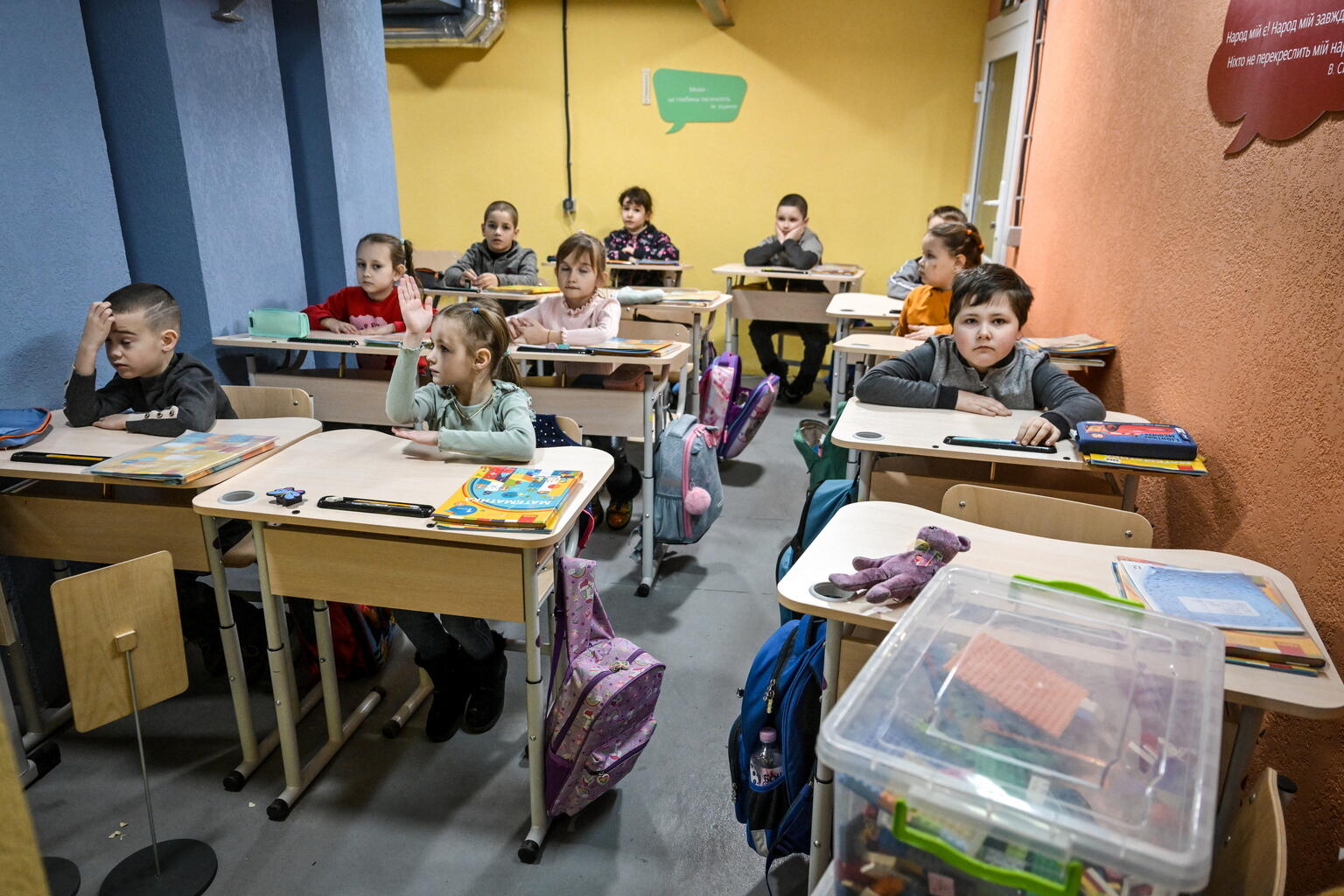空襲警報が発令された後も、地下シェルター内の教室で授業を受ける小学校1年生の子どもたち(ウクライナ、2025年2月25日撮影)