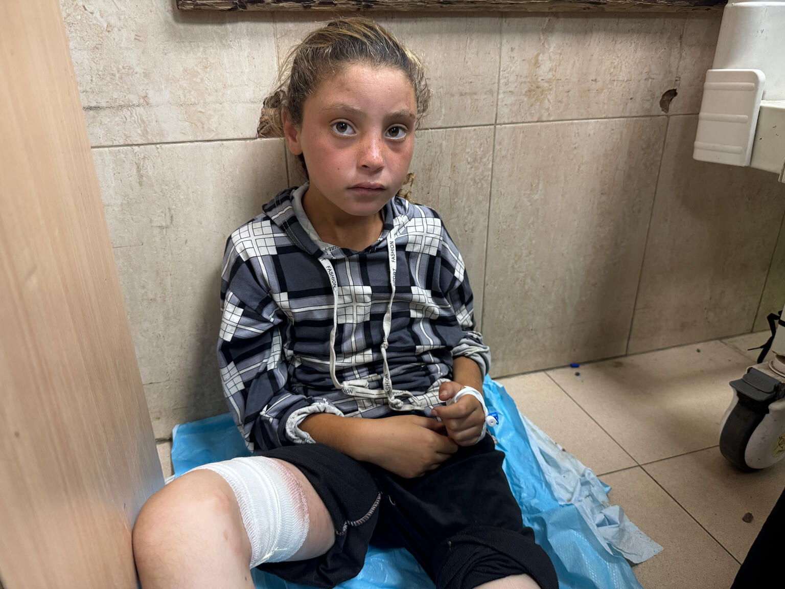 ガザ地区デルバラハで、栄養支援物資の配布の列に並んでいたところ、空爆によりけがをした10歳のリーマさん(パレスチナ、2025年7月10日撮影)