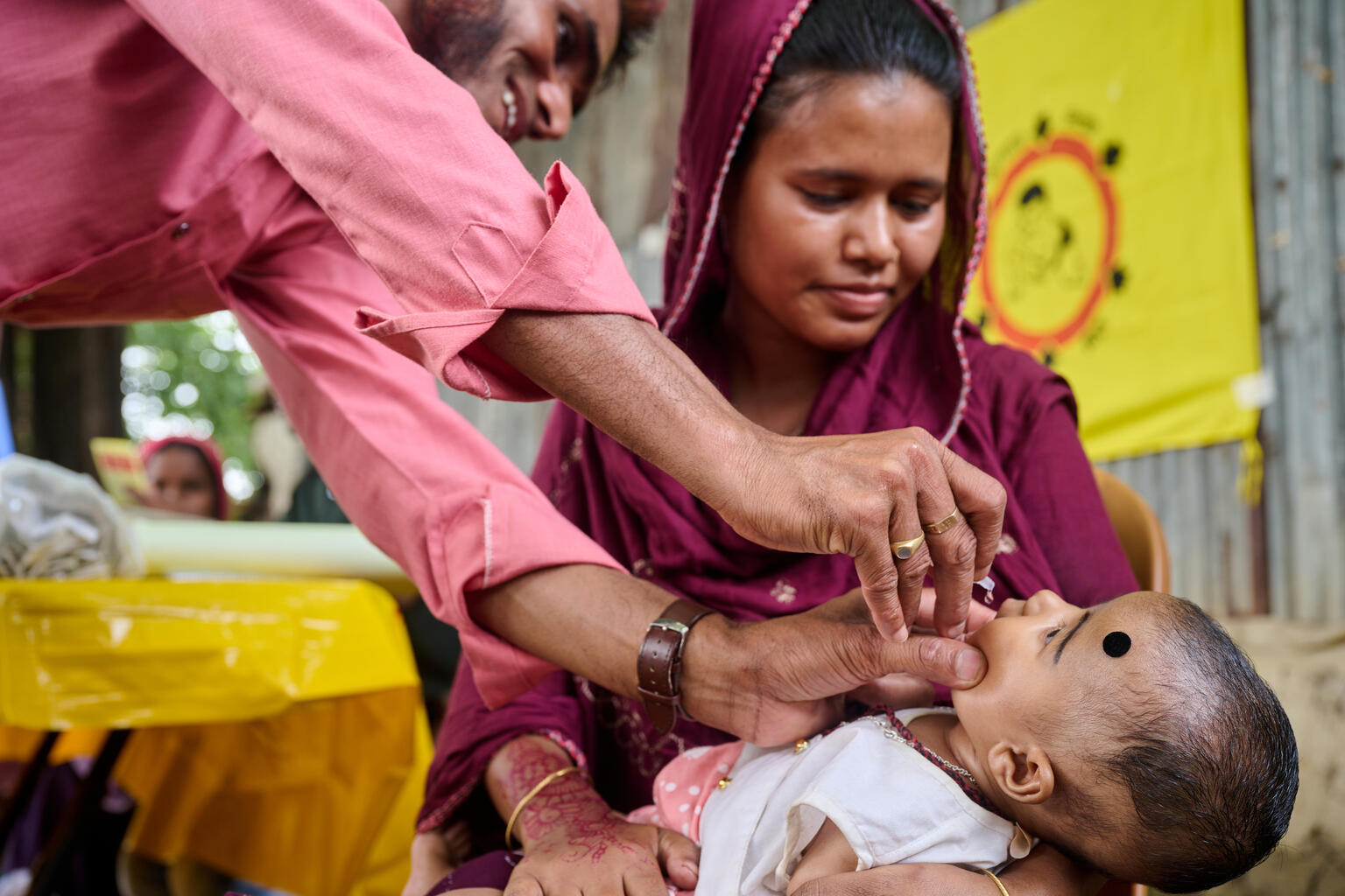 スナムガンジ地区で、経口ポリオワクチンの接種を受ける赤ちゃん(バングラデシュ、2024年4月17日撮影)