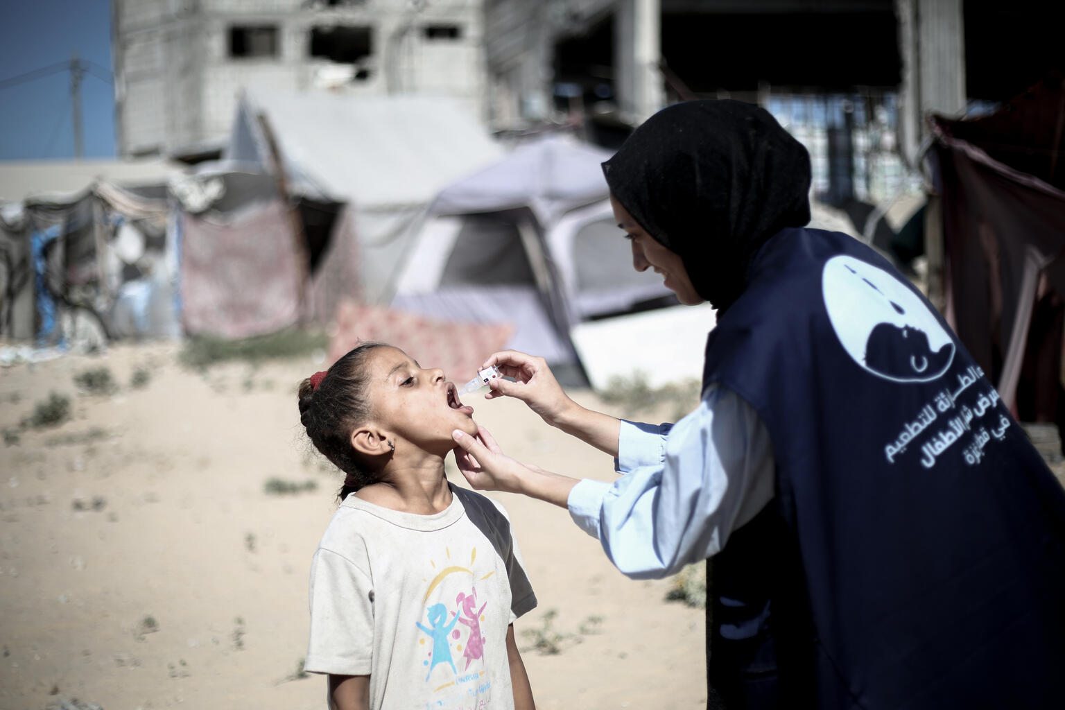 ガザ地区で、2回目のポリオワクチン投与を受ける子ども(パレスチナ、2024年10月19日撮影)