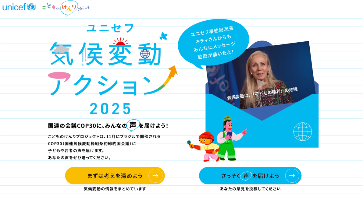 日本ユニセフ協会は、子どもや若者が気候変動を学び、考え、声を上げるためのプロジェクト「ユニセフ気候変動アクション2025」を開始しました。特設サイトでは、未来のために必要な気候変動対策について、子どもと若者たちの意見を募集しています。本サイトは気候変動問題を知るためのコンテンツも掲載しており、学生の皆さまの夏休みの自由研究や調べ学習においても、活用いただけます。