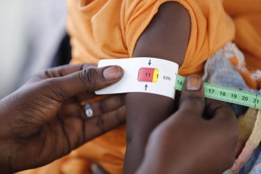 北ダルフール州にあるユニセフ支援の保健センターで、上腕計測メジャーを使った栄養状態の検査を受け、赤色=重度の急性栄養不良と示された子ども(スーダン、2025年5月4日撮影)