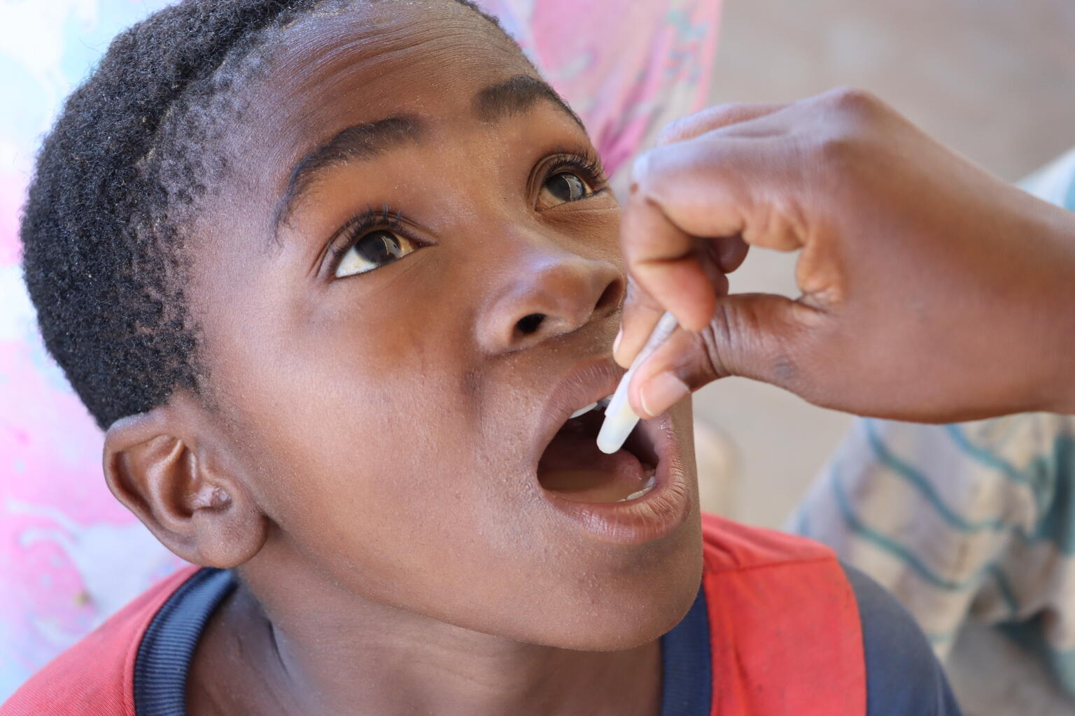 コレラの経口ワクチン投与を受ける男の子。コレラ流行予防のため、洪水の被災地域で集団予防接種が実施された(モザンビーク、2026年2月4日撮影)