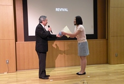 | 入賞者全員で記念撮影 | 見事、最優秀賞に輝いた「Revival」の制作者、岩崎真実子さん |