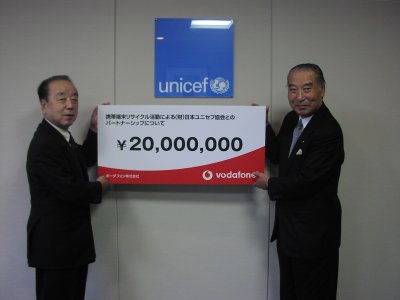 11月6日、4月よりボーダフォン(株)に実施いただいているユニセフ支援プログラムによる寄付金贈呈式がユニセフハウスにて執り行われました。今回は上記2種類のプログラムの内、「ボーダフォン携帯電話リサイクル活動によるユニセフ支援プログラム」を通し、20,000,000円をご寄付いただきました。