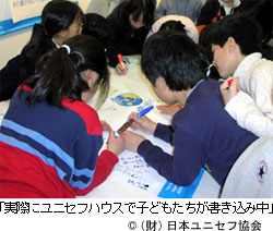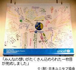 その事業の一環として、全国の子ども達に「世界の子どもたちへの応援メッセージ」を記念フラッグ50枚に書いてもらい、5月1日(日)の東京両国国技館での50周年記念イベントに集め、途上国の子ども達に届けるというメッセージフラッグプロジェクトが始まりました。 国技館イベントの50周年記念シンポジウムには、子どもパネリストが参加。後に続くアトラクションも子どもパフォーマーが主人公になって、会場と一つになって「Children First!子ども最優先!」を訴えます。当然、会場にも沢山の子ども達が招待されますが、当日会場に来れられないもっと多くの子ども達に、募金以外の形でこの50周年イベント、そしてユニセフ支援に参加してもらいたい、という気持ちから生まれたのが、このフラッグメッセージプロジェクトです。 子ども達に書いてもらうメッセージは、世界の子ども達への応援メッセージ。 |