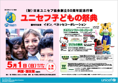 50年にわたってユニセフに寄せられたご支援への感謝の意を表すとともに、世界の子どもたちの権利実現のためのさらなる飛躍を目指して、5月1日(日)東京、両国・国技館にて(財)日本ユニセフ協会創立50周年記念行事「ユニセフ子どもの祭典」が開催されます。