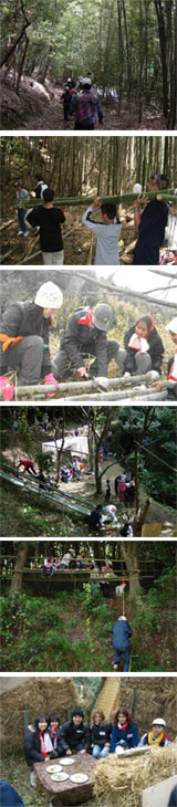 国営明石海峡公園神戸地区 国営明石海峡公園は、近年の余暇時間の増加に伴う、主として近畿地方の広域レクリエーション需要の増大に対応するため設置する大規模公園であり、併せて明石海峡大橋を中心とした明石海峡周辺地域の広域レクリエーションゾーンの形成に寄与するために整備を進めています。本公園は、「自然と人との共生、人と人との交流」を基本理念として、里山の丘陵地に立地する「神戸地区(233.9ha)」と海に面した「淡路地区(96.1ha)」の二つの地区でそれぞれの環境特性を活かした公園づくりが進められています。このうち神戸地区は、里山の環境を守りながら、大規模公園としての特性を活かした憩い、散策、遊びなどを提供する森林自然環境に恵まれた公園として、計画・調査・設計を行っているところです。 ユニセフパークプロジェクト(UPP) ユニセフパークプロジェクトの狙いの一つは、次世代をになう子どもたちが各国の子どもたちと自然の中で互いに協力し、遊び、生活することで、自らの発想と活動を自由に拡げ、「自然や人とのふれあい」「異文化とのふれあいと国際交流」「年配者の持つ技術や知恵の継承と世代間交流」を活性化することにあります。ともに遊び、公園づくりという作業を通じて、世代、性別、国籍などを越えて体験を共有することにより、他者に対する理解を深め、思いやりの心を育てることを目指しています。また、交流の場を森林という自然環境の中に置くことにより、自然を肌で感じ取り、身近な生物や生態系に対する理解を深め、環境問題などに対する関心を喚起することも目指しています。さらには、子どもたちの自由な視点や発想による公園づくりという活動から、都市公園における新たな可能性、利用形態などについて検討しています。 ファシリテーターグループ 子どもたちの活動プログラムやそのサポートはもちろん、キャンプ実施中の様々な企画、運営はファシリテーターと呼ばれるボランティアにより行われます。これらのファシリテーターはただのボランティアではなく、自主的な運営主体として組織され、今回のサマーキャンプでは主催としてその役割を担っています。キャンプ、ワークショップの実施にあたっては、その企画、運営に合わせ、ファシリテーターとしての資質を高めるため独自に講習会なども実施しています。グループの構成は主に10代20代の大学生などが中心となっており、現在、総勢212人が登録されています。そのうち男性21名、女性30名の計51名が中心的に活動しています。 これまでの活動と今年度の予定 平成12年度よりユニセフパークプロジェクトに取り組んでおり、平成13年には80名の子どもの参加を得てプレキャンプ(1泊2日)を試行的に実施し、同様に平成14年にも40名の子どもにより1泊2日のキャンプを開催しました。平成15年には、これまでの試行的なイベントでの結果をふまえ、タイ、フィリピンから海外在住の子ども10名を招待し「国際ワークショップ」(5泊6日のキャンプ)を実施しました。平成16年には、サマーキャンプで40名の子どもを呼び、平成17年3月には、阪神・淡路大震災10周年記念事業の一つ「防災世界子ども会議」とのタイアップにより世界各国の子どもたちを交えた国際ワークショップ(3泊4日のキャンプ)を実施しました。 |