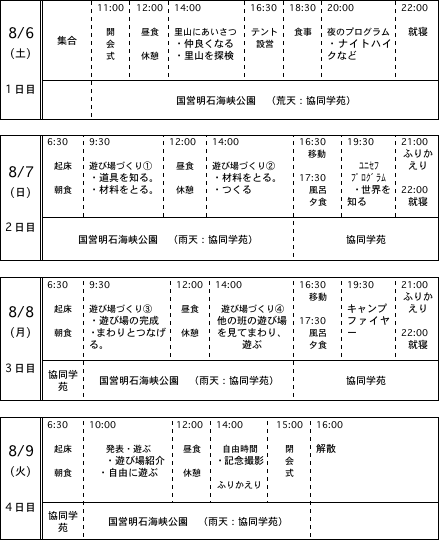 ■サマーキャンプのプログラム:3泊4日(予定) |
