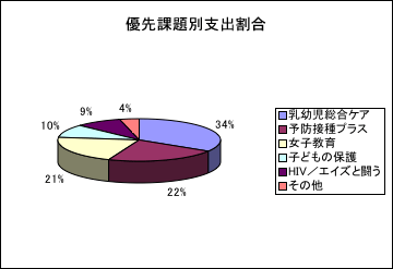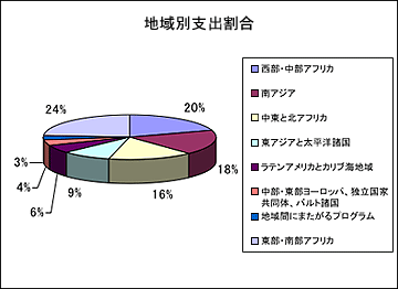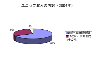 ユニセフの収入はすべて任意拠出によって支えられています。2004年度の総収入は19億7,800万米ドルにのぼり、そのうちの68%(13億3,900万米ドル)が政府・政府間機関からの拠出、29%(5億7,800万米ドル)が非政府/民間部門からの募金によるものでした。3%(6,100万米ドル)はその他の資金源からです。優先課題別、地域別の支出割合は以下のとおりです。