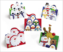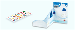 「カラフル・クリスマス」の方は折り目に沿って二つに折ると、愉快な動物たち、サンタたち、雪だるまたちがくっきり。平らな所に立てて飾りましょう。ちょっとしたギャラリーの ようで、クリスマスの雰囲気を盛り上げます。贈られたカードがこのように活用されれば、楽しさもきっと 倍増することでしょう!
