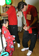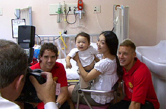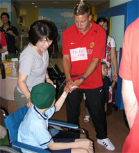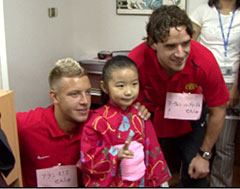 今回の来日でクラブが訪問先に選んだのは、日本ユニセフ協会大使の日野原重明氏が理事長を務める聖路加国際病院の小児病棟。 様々な病気と闘いながら一生懸命生きている子どもたちを、2004年以来、クラブで活躍するアラン・スミス選手と、ドイツ・バイエルンから移籍してきたばかりのオーウェン・ハーグリーブス選手が訪問しました。手作りのサッカーボールを作ったり、浴衣を着たりして、到着の1時間以上も前から2人の訪問を首を長くして待っていた30人以上の子どもたちの歓声に迎えられた両選手。子どもたちと握手を交わし、サインや記念写真の求めに笑顔で応えていました。両選手はまた、病室を離れられない子どもたちの部屋も訪れ、優しく声を掛けて回りました。