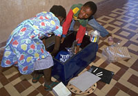 2)スクール・イン・ア・ボックス — 1〜2クラス分の教材や学用品が入った教育キット。緊急事態の発生後、72時間以内に、被災地で学校活動を再開させることができます。