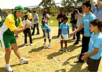 「クリケットワールドカップにしインド諸島大会」では、HIV/エイズの脅威に晒されている世界の子どもたちの現状を訴えるため、大会期間中、多くの選手がキャンペーン・リボンを身につけてプレーし、また40人以上の選手がユニセフの公共CMに参加しました。そして、ユニセフが支援するプロジェクトや学校を訪問し、選手自らが、HIV/エイズに感染している子どもたちを勇気付けるとともに、子どもたちが置かれている現実を学びました。