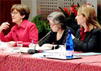 子どもの売買についての会議の模様。左から、国連子どもの権利委員会のネベナ・ブコビック・サホビックさん、ユニセフ・イノチェンティ研究所 主任マルタ・サントス・ペイス、欧州委員会の専門家アタナシア・シキオトさん。 |