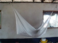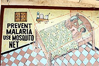 “マラリア予防のために、蚊帳を使おう”というスローガンの、リベリアにある病院の壁絵。 |