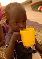 | ユニセフ支援の栄養補給センターで治療用のミルクを飲む栄養不良の子ども(スーダン・ダルフール) |