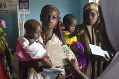 | 子どもにはしかの予防接種をしてもらうために列を成す女性たち。 |