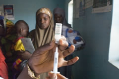 | 注射器にはしかのワクチンを注入する保健員。向こうには予防接種カードを持って、順番を待つ母子が見える。 |