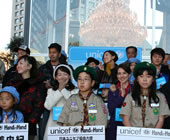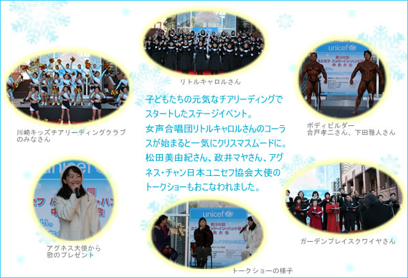 11月と12月の2ヶ月間にわたっておこなわれたユニセフ募金キャンペーン『第30回ユニセフ・ハンド・イン・ハンド募金』。一斉行動日である12月23日(祝)には、恵比寿ガーデンプレイスのイベント会場と都内の主要駅で、30名以上の著名人と300名にのぼる子どもたち、ボランティアの方々が街頭に立ち、ユニセフ募金を呼びかけました。 「子どもたちがみな幸せでありますように」「ありがとうございます!」「がんばってください」呼びかける側とそれに応えてくださるたくさんの方々との間に、温かな気持ちが伝わりました。