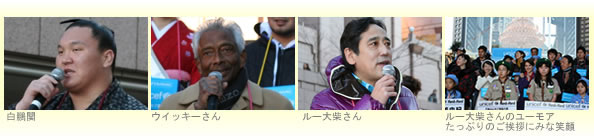 各界から集まった30名以上の著名人がゲストボランティアとして一同に会しました。横綱・白鵬関、ウイッキーさん、ルー大柴さんからご挨拶いただき、世界の子どもたちのためにがんばろうとみんなの心がひとつに。