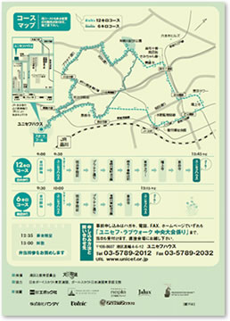 | 参加費: | 大人 500 円、 こども(18歳未満) 200 円(共にユニセフ募金、完歩証、保険の費用を含む) | |