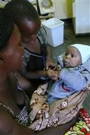 | ジンバブエのチェルストン診療所の外で母親に抱かれる生後10週目の男の子。 |