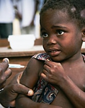 | モザンビークのナムラヴァ村の保健所ではしかの予防接種を受けるドラちゃん(3歳)。モザンビークは5歳未満死亡率の最も高い国のひとつ。 |