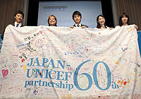 北海道で開催された2008年J8(ジュニア・エイト)サミットに参加し、同年のG8サミットの席上で世界のリーダーたちに子どもの宣言を行なった日本の高校生3人が、ベネマン事務局長に記念バナーを手渡しました。このバナーには世界の子どもとユニセフに向けた日本の子どもたちのメッセージ100余りが記されています。