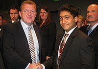 | デンマークのラース・ロッケ・ラスムセン首相(左)と握手するモハメド・アグザム・マウムーンくん(右)。 |