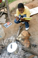 | ワークショップ3日目の撮影日。アルバート・テッフォ(15歳)は、良いカメラアングルでお鍋を撮影するため腰を落とし目線を低くしている。 |