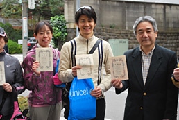 | 飛び入り参加された元F1ドライバーの中野信治さん(写真中央)とミュージシャンの高橋康子さん(写真左)も、12キロコースを完歩されました!(写真右は日本ユニセフ協会の早水研専務理事) |