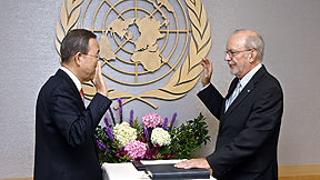 | ニューヨークの国連本部で就任の宣誓をするパン・ギムン国連事務総長(左)とアンソニー・レーク氏(右)。 |