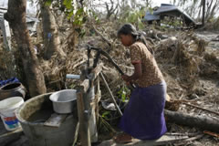 | サイクロンに襲われ、瓦礫の中で水を汲む女性。 |