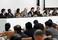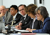 | ユニセフ執行理事会で発言するマルタ・サントス・パイス 子どもへの暴力に関する国連事務総長特別代表(右端)。 |