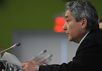 | 2010年ユニセフ執行理事会で、日本ユニセフ協会を通じた日本のみなさまのユニセフに対する多大な貢献の歴史や、現在の取り組みを報告する早水研専務理事。 |