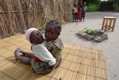 | ザンビアのチルンバ村にある自宅の前で、弟(生後8ヵ月)を抱く女の子(4歳)。 |